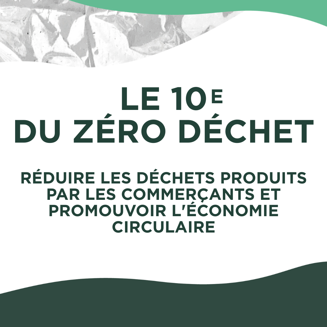 Le 10e du zéro déchet est un accompagnement personnalisé et gratuit de 5 commerçants alimentaires afin d’éviter, de réduire, et de revaloriser leurs emballages à usage unique (films plastiques, sachets et emballages, palettes et cagettes, cartons d’expédition…).
